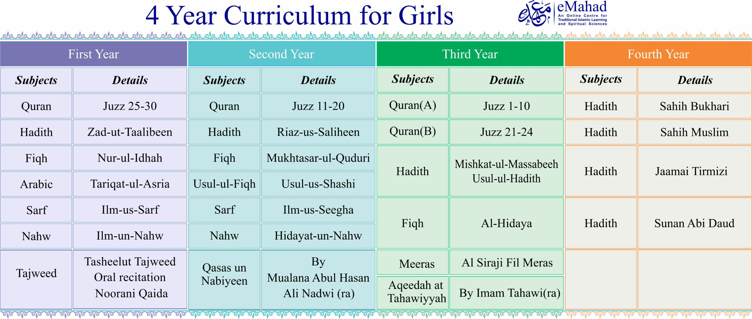 The Alimah Program is principally designed for students who wish to acquire in-depth knowledge of Islamic sciences. The program covers the traditional curriculum, Dars-e-Nizami of the ‘Alimahcourse’ which includes: